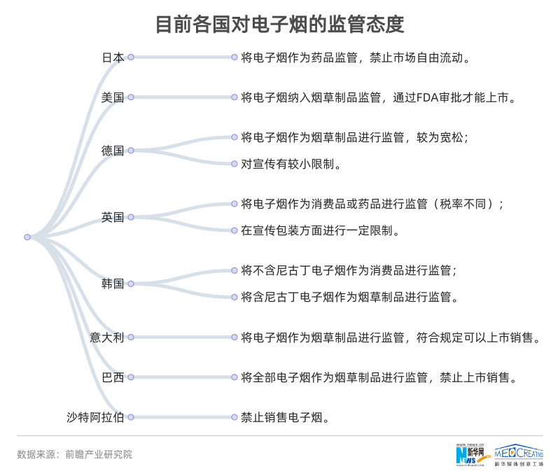 ????? 目前,各國對電子煙銷售的監(jiān)管思路和態(tài)度也各不相同,如美國、德國、英國等國都有對電子煙嚴(yán)格的監(jiān)管,沙特阿拉伯等國家禁止銷售電子煙。