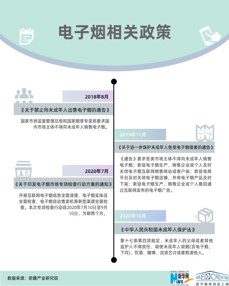 ????? 此前,我國關(guān)于電子煙的政策監(jiān)管問題一直是懸在電子煙行業(yè)之上的“達(dá)摩克利斯之劍”。2018-2020年,我國針對電子煙逐步出臺了相關(guān)政策,尤其是對容易落入誘惑陷阱的未成年增強了保護(hù),并開始禁止網(wǎng)上銷售,電子煙的監(jiān)管措施正在逐步加強。