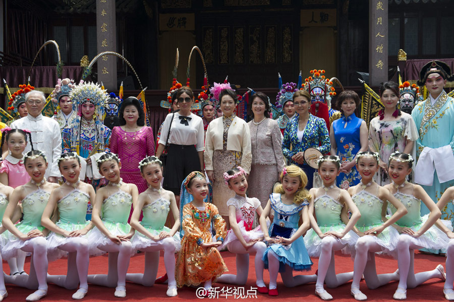 ????彭麗媛和貴賓們到上海豫園,參觀金山農民畫、面塑、顧繡、木版水印、扎染等展示,欣賞少兒歌舞《茉莉花》、昆曲《牡丹亭》選段、滬劇與二胡《燕燕做媒》、太極·古琴《高山流水》、京劇選段《梨花頌》等演出。