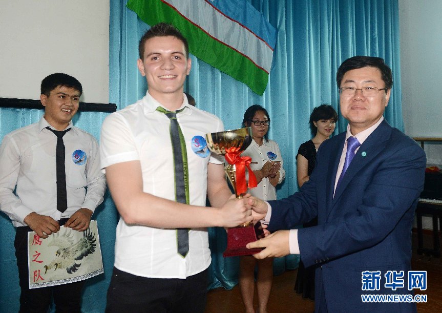 ??? 6月9日,烏茲別克斯坦首都塔什干的烏世界語言大學(xué)禮堂,中國駐烏茲別克斯坦使館孫立杰大使在向獲得冠軍的鷹之隊(duì)頒獎(jiǎng)并合影留念。。