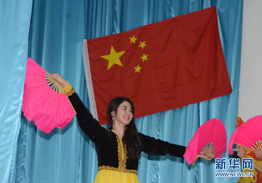 6月9日,學(xué)生代表在烏茲別克斯坦首都塔什干的烏世界語(yǔ)言大學(xué)禮堂表演節(jié)目。