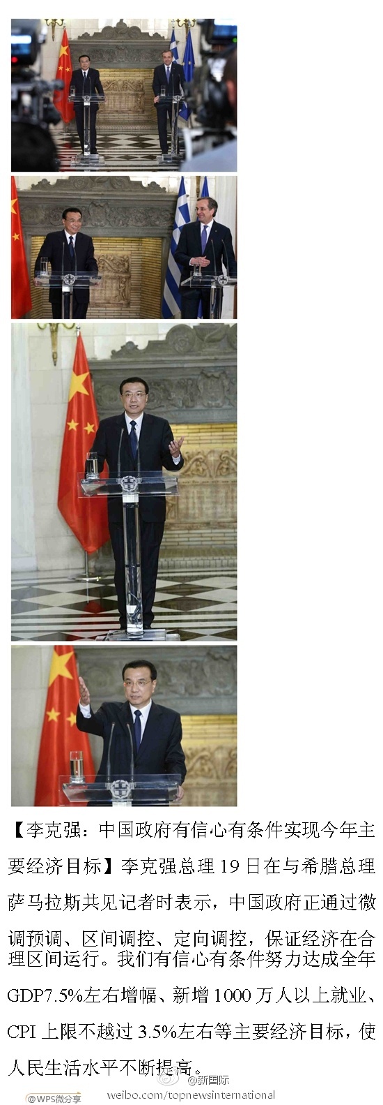 ??? 新華網北京6月20日電 據新華社“新國際”微博報道,李克強總理19日在與希臘總理薩馬拉斯共見記者時表示,中國政府正通過微調預調、區間調控、定向調控,保證經濟在合理區間運行。