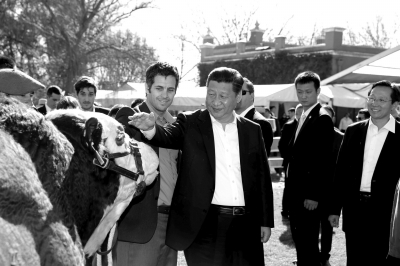 ????習近平受到農場主莫內塔一家熱情迎接。莫內塔向習近平介紹,莊園畜養牲畜近萬頭,培育了許多優秀種馬和肉牛品種。習近平邊聽邊詳細詢問牲畜養殖和農場經營情況。習近平指出,阿根廷是農牧業大國,農業現代化水平和科技水平很高。中國也是農業大國。中國要發展,必須首先解決好13多億人口吃飯問題。中國高度重視農業,堅持立足國內、確保糧食自給自足,同時積極利用國際市場,參與國際合作,調劑農副產品。中方愿意同阿方加強農業領域合作,擴大農產品貿易。
