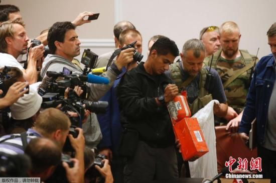 當?shù)貢r間2014年7月22日,頓涅茨克,“頓涅茨克人民共和國”官員向馬來西亞調查人員移交馬航MH17航班客機黑匣子。