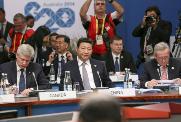 ????(圖為2014年11月15日,二十國集團領導人第九次峰會在澳大利亞布里斯班舉行。國家主席習近平出席會議并發表題為《推動創新發展 實現聯動增長》的重要講話。新華社發)