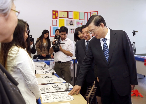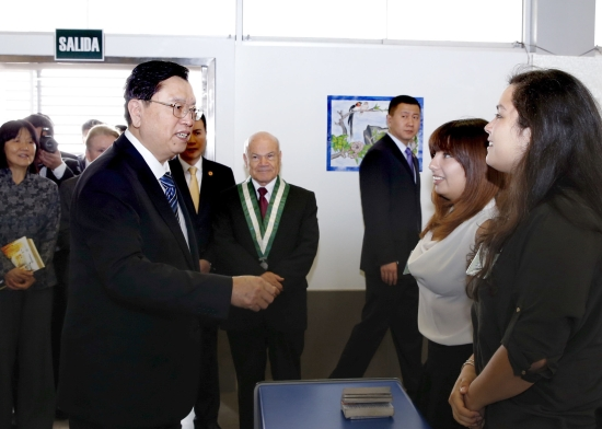 ??? 22日,全國人大常委會委員長張德江參觀秘魯里卡多·帕爾瑪大學孔子學院,與在這里學習中文的秘魯學生交流。