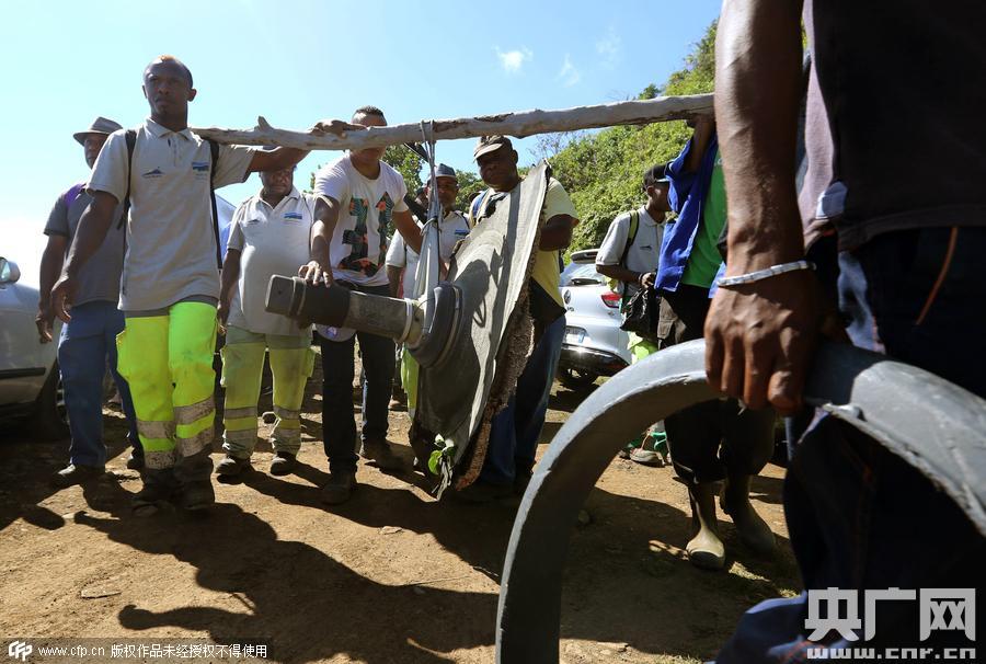 當(dāng)?shù)貢r間2015年8月11日,法屬留尼汪島,當(dāng)?shù)厮丫汝?duì)獲得的馬航MH370殘骸。