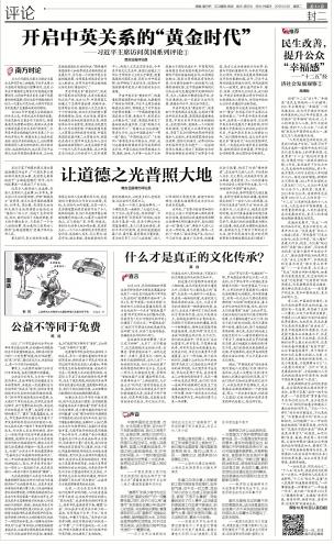 英國駐華大使吳百納連續(xù)用了四個“黃金”來形容習近平主席此次訪英的意義:“今年是中英關(guān)系的黃金年,這將是一次黃金訪問,它證明中英關(guān)系的發(fā)展處于黃金時期。訪問將確立中英面向21世紀的全球伙伴關(guān)系,開啟中英關(guān)系史上的黃金10年?!蔽覀兤诖⑾嘈?,這次為開啟中英關(guān)系“黃金時代”而往的里程碑式訪問,一定能成功打造中英關(guān)系新格局、繪制兩國關(guān)系新藍圖、開辟務實合作新前景、樹立國際合作新典范。(南方日報評論員)