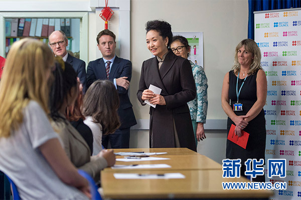 在英國教育部國務大臣吉布、學校校長等陪同下,彭麗媛觀看學生們用中文進行的才藝表演,參觀學校成果展,觀摩中文課,與女學生們互動交流,并向學校贈送中國文化及漢語學習類圖書及音像制品。