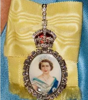 女王的徽章由黃色緞帶、女王年輕時的畫像和一頂用紅色琺瑯裝飾的都鐸皇冠組成。