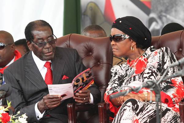 2015年2月28日,津巴布韋總統穆加貝與夫人格蕾絲在民眾為穆加貝舉行的91歲生日大型慶典上翻閱小冊子。新華社發(費列蒙攝)