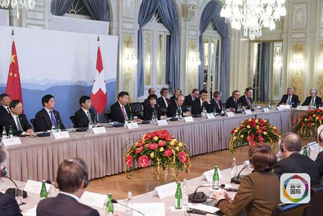 1月16日,國家主席習近平在伯爾尼同瑞士聯邦主席洛伊特哈德共同會見瑞士經濟界代表。(新華社記者 李學仁 攝)