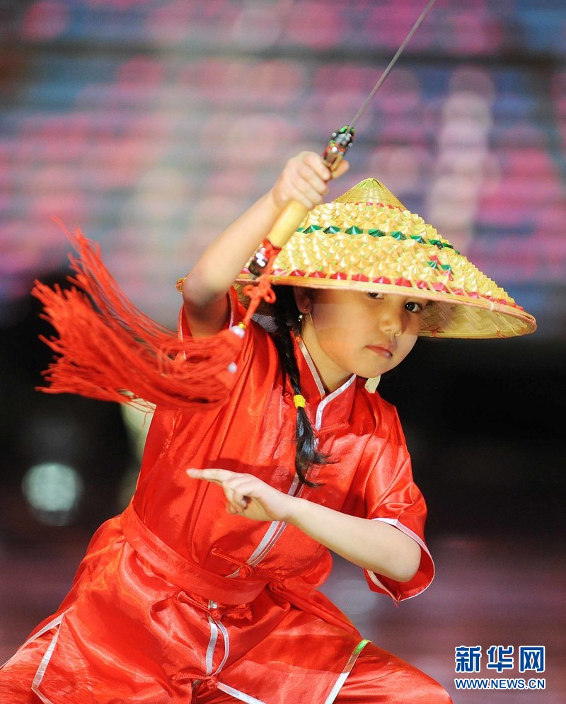 1月18日晚,烏茲別克斯坦首都塔什干人民友誼宮,烏茲別克斯坦中華民族文化中心武術隊隊員在表演武術。