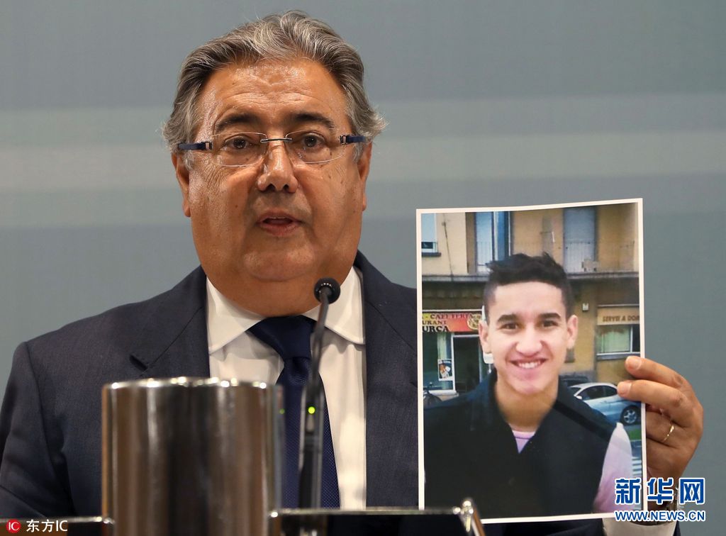 當地時間2017年8月21日,西班牙內政部長展示巴塞羅恐襲案嫌犯照片,尤尼斯·阿布雅各布。