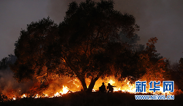 12月11日,在美國加利福尼亞州卡平特里亞,消防員在山火現場工作。新華社記者李穎攝
