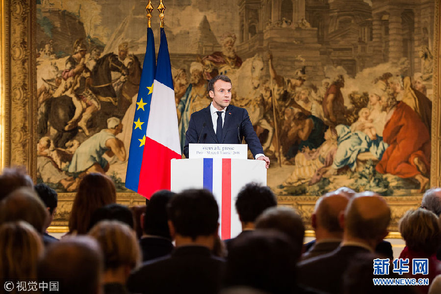1月3日,法國總統馬克龍在愛麗舍宮向記者團送上新年祝福。(圖片來源:視覺中國)