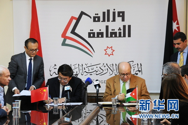 新華社安曼1月8日電(記者林曉蔚)中國駐約旦大使潘偉芳和約旦文化大臣納比·舒古姆8日在約旦首都安曼共同簽署了《中華人民共和國政府和約旦哈希姆王國政府關(guān)于在約旦設(shè)立中國文化中心的協(xié)定》。