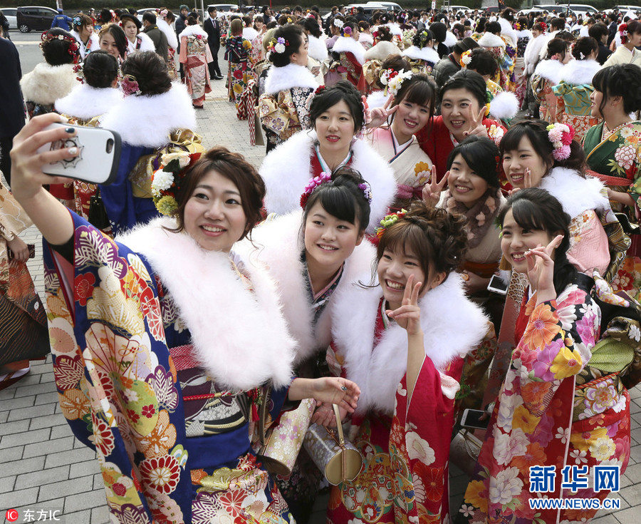 日本和服妹子出席“成人節”慶祝儀式 開心玩自拍