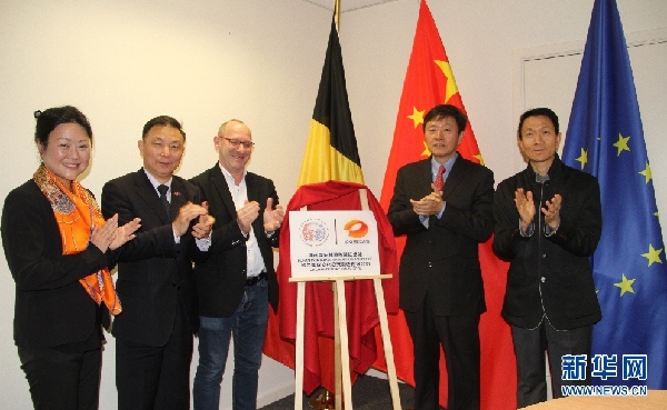 中國駐歐盟使團公使銜參贊李建民(前排左二)、中國駐比利時大使館文化參贊向世海(前排右一)、湖南衛視國際頻道總監甘霖(前排右二)和比利時法語廣播電視臺的特別代表(前排左三)共同為聯絡處揭牌。新華網發(潘革平攝)
