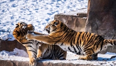哈爾濱東北虎進行野化訓練 雪地里追雞