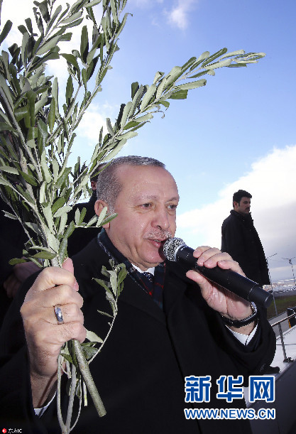 當地時間2018年2月17日,土耳其埃斯基謝希爾,土耳其總統埃爾多安出席正義與發展黨集會,手持橄欖枝發表講話。(圖片來源:東方IC)
