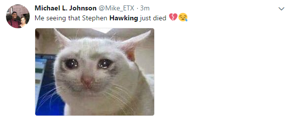 有網(wǎng)友在社交媒體平臺推特發(fā)文“剛剛看到霍金去世的消息”,并配上了哭泣的圖片。↑