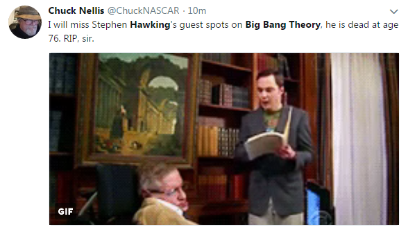 有網(wǎng)友說:“至少我們能在《生活大爆炸》中,反復看到霍金教授。” ↑