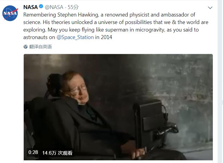 美國國家航空航天局(NASA)14日在推特上發文稱,霍金的理論為我們的探索開啟了一系列可能。愿你像超人一樣飛行于微重力中。