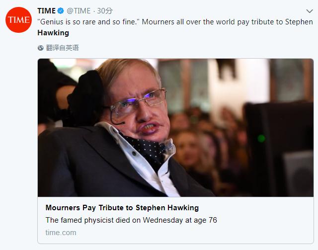 英國廣播公司(BBC)表示,一個聰明的頭腦,有點“惡趣味”,一個足矣容納宇宙的心臟。在星辰中安息吧,霍金。