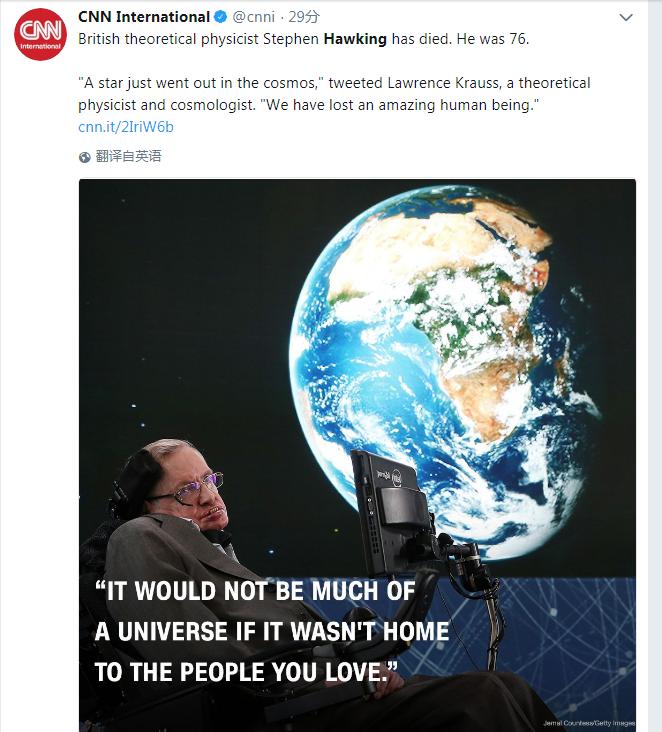 美國有線電視新聞網(CNN)引用理論物理學家、宇宙學家Lawrence Krauss的推特說:“一顆星剛剛在宇宙中熄滅,我們失去了一位了不起的人”。