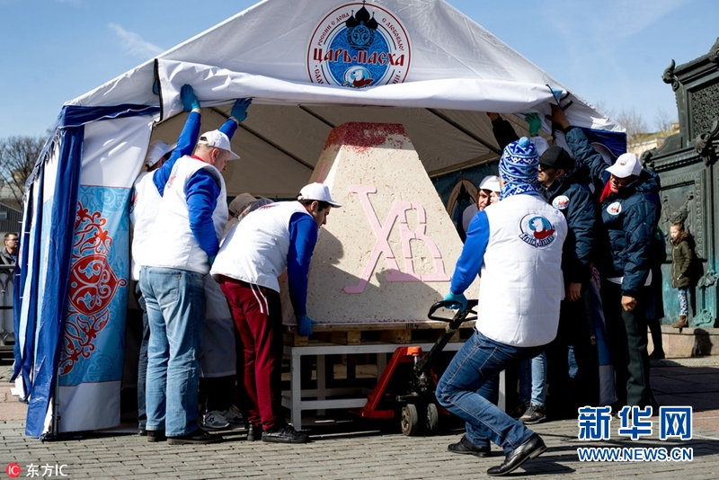 當地時間2018年4月8日,俄羅斯莫斯科,為慶祝東正教復活節,莫斯科救世主大教堂前現一個1141公斤的傳統復活節蛋糕,打破吉尼斯世界紀錄。(圖片來源:東方IC