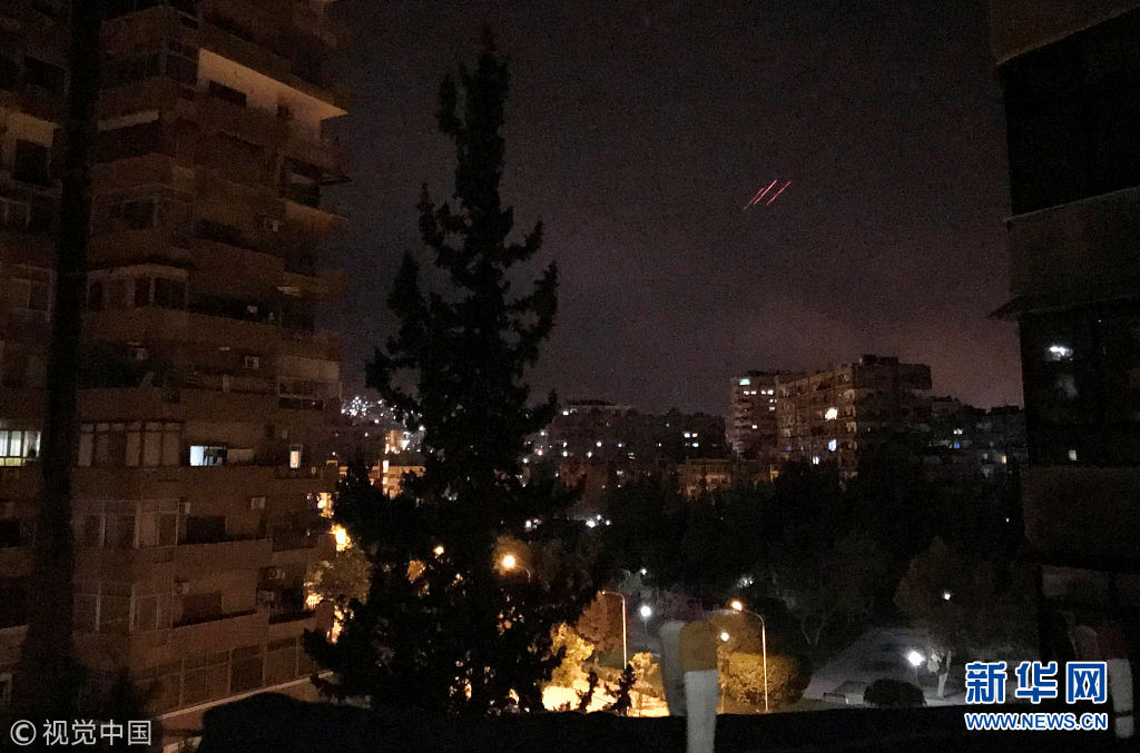 4月14日,敘利亞大馬士革,特朗普決定聯合英國和法國對敘利亞進行精確打擊,大馬士革傳出爆炸聲,敘利亞方面進行反擊。敘利亞阿拉伯敘利亞通訊社(SANA)報道,敘政府軍在大馬士革以南地區擊落13枚導彈。敘利亞國家電視臺此前稱美英法三國對敘利亞“發動了侵略”。(圖片來源:視覺中國)