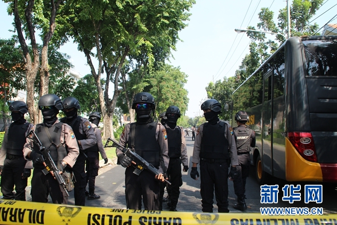 5月13日,在印度尼西亞東爪哇省泗水市,安全人員在發(fā)生爆炸的教堂外警戒。印度尼西亞東爪哇省泗水市三座教堂13日發(fā)生爆炸。 新華社發(fā)(庫爾尼亞萬攝)
