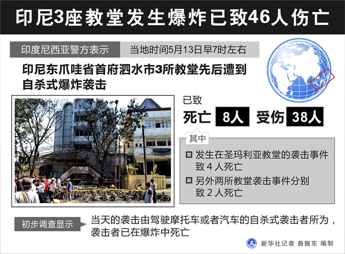 圖表:印尼3座教堂發(fā)生爆炸已致46人傷亡 新華社記者 曲振東 編制