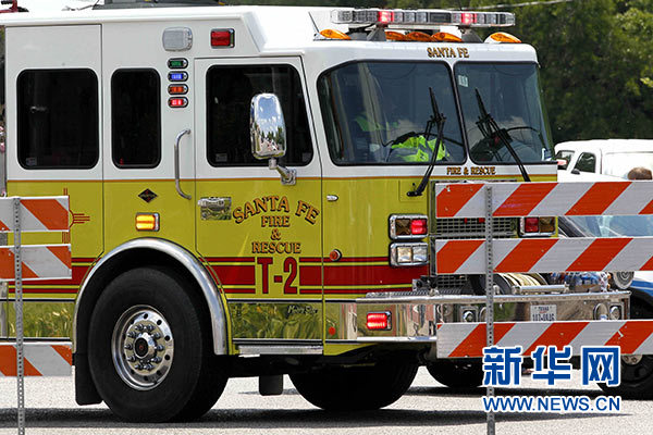 5月18日,在美國得克薩斯州加爾維斯頓郡圣菲市,一輛消防救援車在發(fā)生槍擊的圣菲高中附近待命。新華社發(fā)(宋穹 攝)