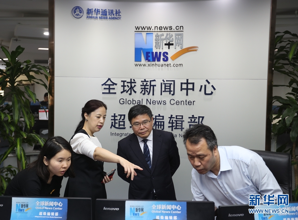 5月16日,外交部拉美司司長趙本堂(左三)接受了新華網獨家專訪。圖為新華網副總編輯劉娟(左二)介紹新華網情況。新華網記者 郭小天攝