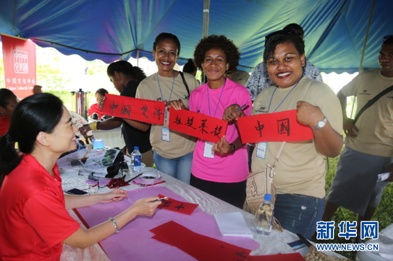 斐濟青少年在展示她們的毛筆字杰作。 新華網記者張永興 攝