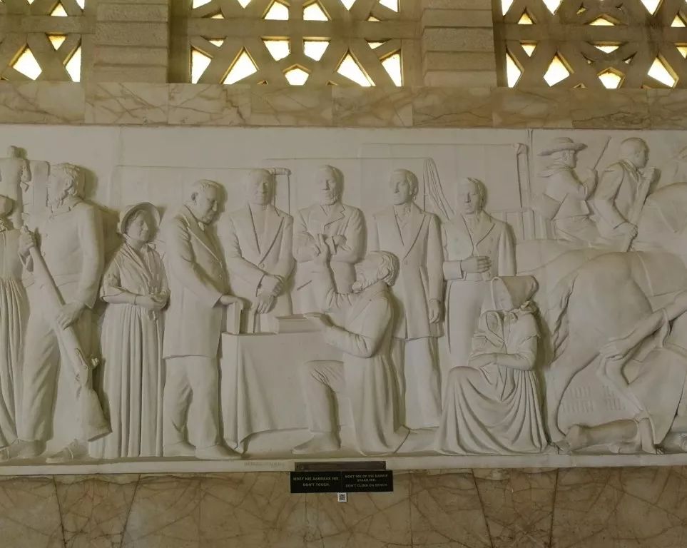 在紀(jì)念館大堂里的巨大拱形窗下,27幅浮雕詳細(xì)講述了當(dāng)年(1835-1852)荷裔布爾人大遷徙的歷史。每幅浮雕下面,都有一個二維碼。