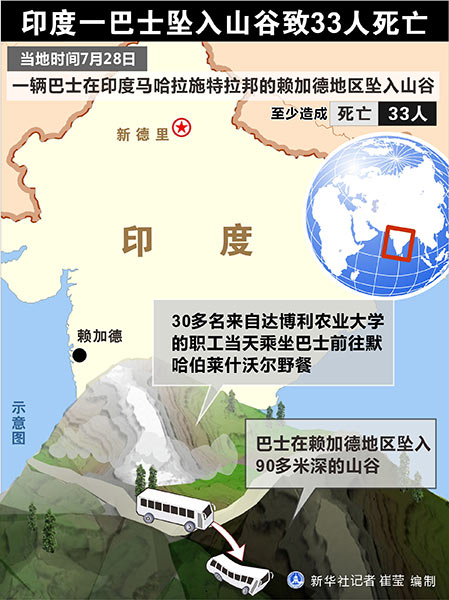 新華社新德里7月28日電(記者 姜磊)一輛巴士28日在印度馬哈拉施特拉邦的賴加德地區墜入山谷,警方說車禍造成至少33人死亡。