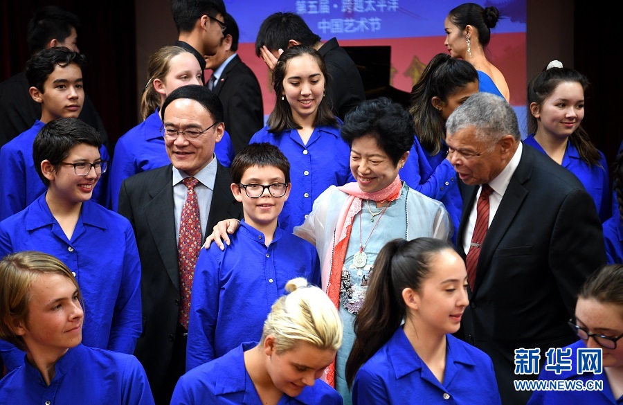 9月7日,在美國舊金山舉行的第五屆“跨越太平洋——中國藝術節”開幕式上,皮德蒙特東灣兒童合唱團成員與來賓合影。第五屆“跨越太平洋——中國藝術節”開幕式7日在中國駐舊金山總領事館舉行。美國民間友好團體、藝術界人士等230多人出席。 新華社記者吳曉凌攝