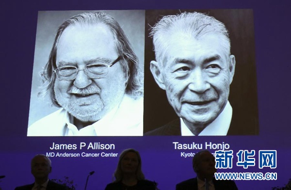 10月1日,在瑞典斯德哥爾摩卡羅琳醫(yī)學院舉行的新聞發(fā)布會現(xiàn)場,大屏幕顯示美國科學家詹姆斯·艾利森(左)和日本科學家本庶佑的照片。 新華社記者葉平凡攝