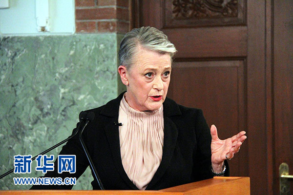 10月5日,在挪威首都奧斯陸,挪威諾貝爾委員會主席貝麗特·賴斯-安德森宣讀授獎聲明。新華社記者 張淑惠 攝