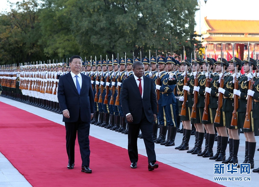 10月9日,國家主席習(xí)近平在北京人民大會堂同安哥拉總統(tǒng)洛倫索舉行會談。這是會談前,習(xí)近平在人民大會堂東門外廣場為洛倫索舉行歡迎儀式。 新華社記者劉衛(wèi)兵攝
