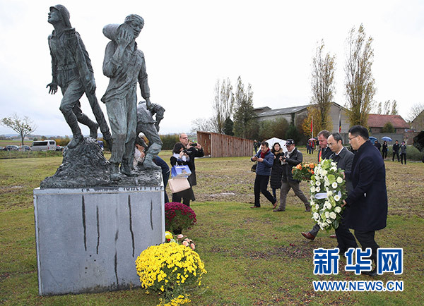 11月10日,在在比利時西佛蘭德省波珀靈厄市華工雕像園,中國駐比利時大使曹忠明(右二)、波珀靈厄市市長克里斯托弗·德雅蓋(右三)等向華工雕像敬獻(xiàn)花圈。 新華社記者 葉平凡 攝