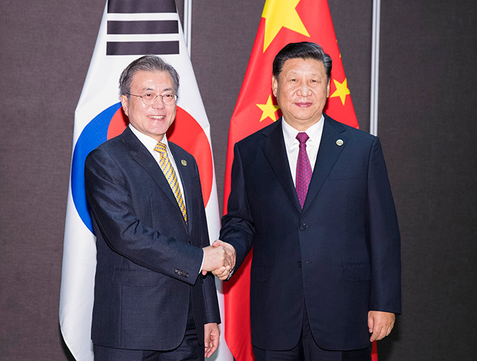 11月17日,國家主席習(xí)近平在莫爾茲比港會(huì)見韓國總統(tǒng)文在寅。新華社記者 黃敬文 攝