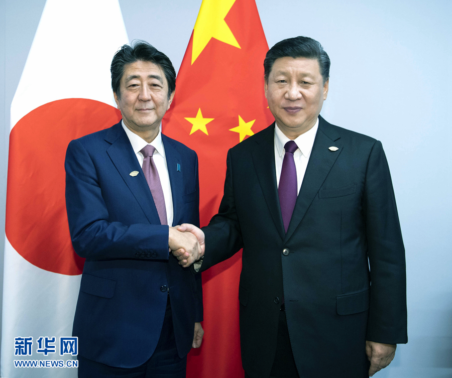 ——會見日本首相安倍晉三,指出雙方要建設(shè)性地把握好中日關(guān)系發(fā)展方向,在中日四個政治文件原則基礎(chǔ)上,共同開辟兩國關(guān)系新前景。