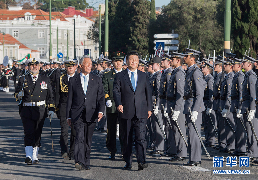 習近平和夫人彭麗媛乘車抵達帝國廣場時,德索薩上前熱情迎接。兩國元首登上檢閱臺。軍樂隊奏中國、葡萄牙兩國國歌,同時鳴21響禮炮。在德索薩陪同下,習近平檢閱儀仗隊,隨后前往觀禮臺觀看分列式。廣場外,簇擁的人群揮舞著中國國旗,高聲呼喊熱烈歡迎習主席。