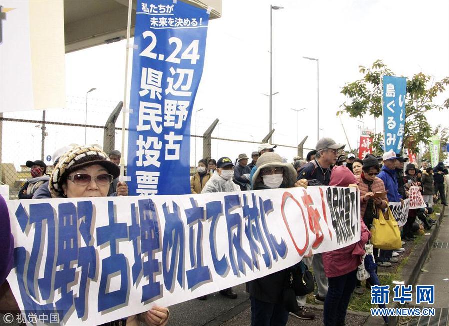 當(dāng)?shù)貢r(shí)間2019年1月26日,日本沖繩縣名護(hù),民眾在美國(guó)海軍陸戰(zhàn)隊(duì)施瓦布軍營(yíng)門前舉行集會(huì),呼吁在2月24日的地方公投中投票反對(duì)美國(guó)海軍陸戰(zhàn)隊(duì)普天間空軍基地的搬遷計(jì)劃。(圖片來(lái)源:視覺(jué)中國(guó))