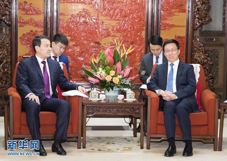 韓正表示,中哈是友好鄰邦和全面戰(zhàn)略伙伴。在習(xí)近平主席和納扎爾巴耶夫總統(tǒng)的戰(zhàn)略引領(lǐng)和親自推動(dòng)下,中哈關(guān)系保持高水平運(yùn)行,已成為國與國之間和睦相處、互利共贏的典范。雙方高層交往密切,政治互信不斷增強(qiáng),共建“一帶一路”成果豐碩。希望雙方進(jìn)一步發(fā)揮好中哈合作委員會(huì)重要作用,加強(qiáng)發(fā)展戰(zhàn)略對(duì)接,推進(jìn)經(jīng)貿(mào)、投資、海關(guān)、金融等領(lǐng)域務(wù)實(shí)合作,支持兩國企業(yè)按商業(yè)化市場(chǎng)化原則加強(qiáng)項(xiàng)目合作,推動(dòng)中哈合作不斷取得新進(jìn)展。