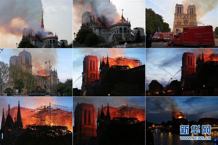 這張拼版照片顯示的是4月15日,在法國巴黎,巴黎圣母院燃起大火。當地時間15日傍晚,位于巴黎市中心、有著800多年歷史的巴黎圣母院發生大火,熊熊烈火之中,巴黎圣母院塔尖轟然倒塌,整座建筑損毀嚴重。新華社發